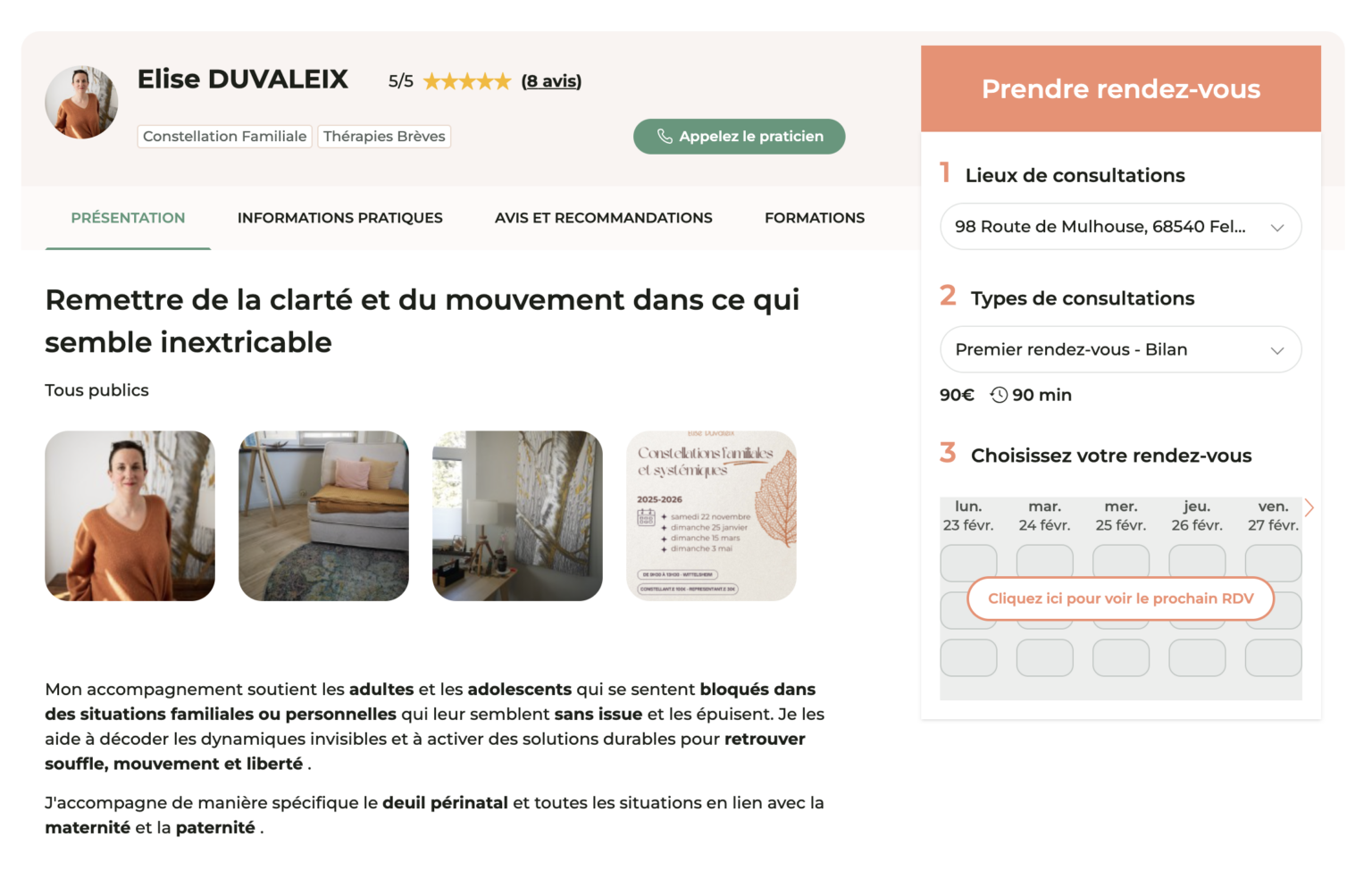 Si vous arrivez en avance, merci de patienter en salle d’attente : je viendrez vous chercher pour votre consultation. Elle se situe dans le couloir du bâtiment.